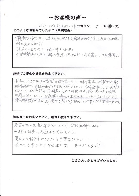 永年のデスクワークの影響が積み重なり、腰を基点に姿勢が偏り、特定部所に負担が集まりがちだと感じていた。身体全体のバランス補正しないと、また季節ごと、寒暖差の大きい時期は心配の思いから、通院を続けている。お陰様で普段の生活の中、ゴルフ、ウォーキングでも腰の廻り、粘りが増し、足の運びも軽くなり、動くことが苦にならず楽しめている。