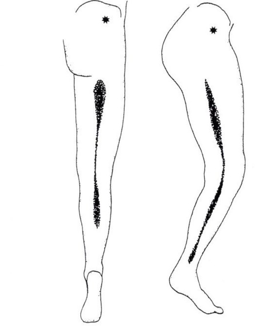 イラストのように、お尻の筋肉のコリ(★印)がひどくなると、腰やお尻だけでなく、離れた部分にある太ももやふくらはぎにまで痛みやしびれ感が出ることがあります。
