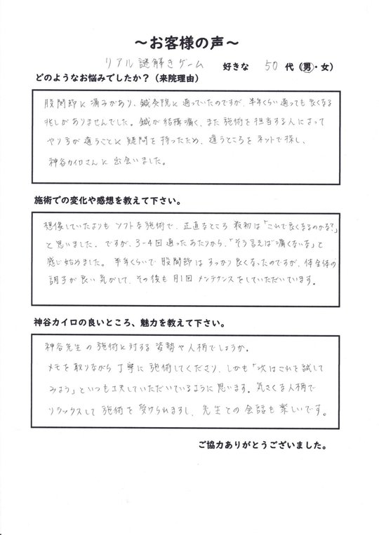 股関節に痛みがあり、鍼灸院に通っていたのですが、半年くらい通っても良くなる兆しがありませんでした。鍼(はり)が結構痛く、また整体を担当する人によってやり方が違うことに疑問を持ったため、違うところをネットで探し、神谷カイロさんに出会いました。