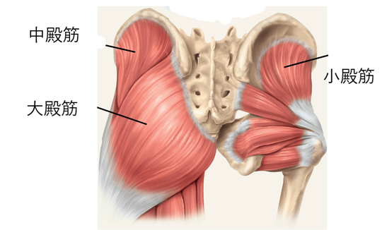 お尻は専門的には臀部(でんぶ)というので、お尻の筋肉のことを殿筋(でんきん)と呼んでいます。