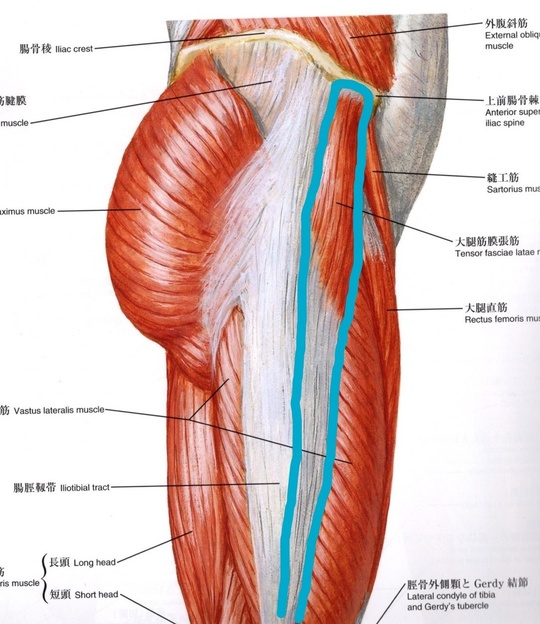 先ほどの殿筋よりも名前が長いですが、大腿(だいたい)とは太もものことで、太ももの外側にピンと張っている細長い筋肉です。