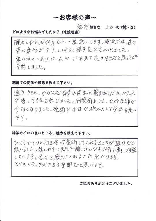 お客様の声【首痛+腕のしびれ】50代 男性
