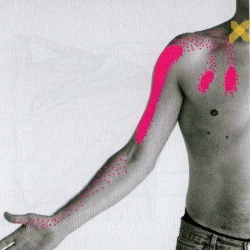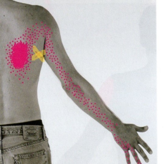 黄色の×印に筋肉のこりができると、×印から離れたピンクの場所(腕や指)の方に痛みが出るということです