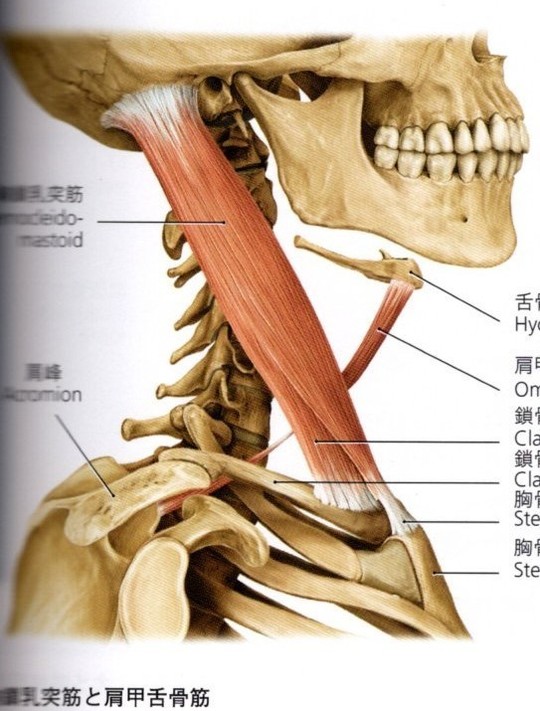 この筋肉は胸鎖乳突筋(きょうさにゅうとつきん)と言います。