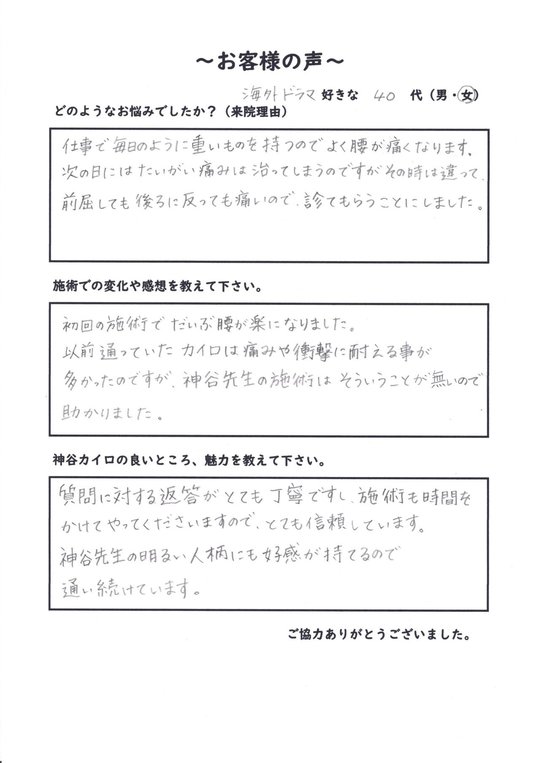 施術でだいぶ腰が楽になりました。以前通っていたカイロは(乱暴にボキボキするところだったので)痛みや衝撃に耐える事が多かったのですが、神谷先生の施術はそういうことが無いので助かりました。
