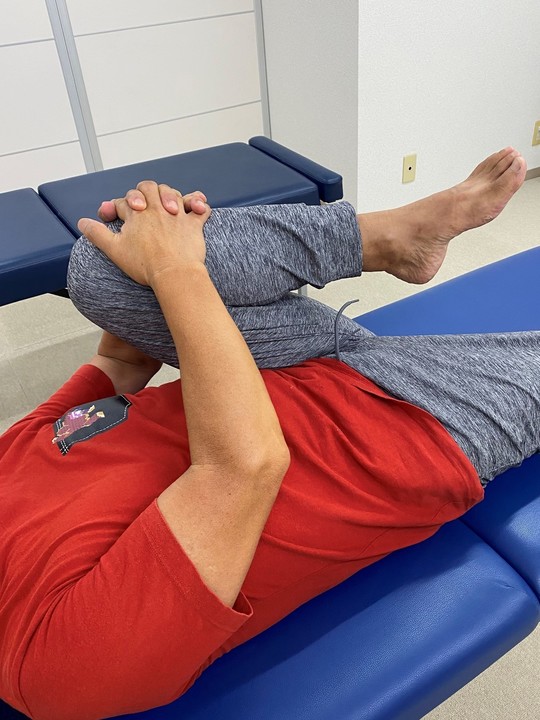 写真のように、片方の膝を抱えるようにして、20~30秒キープしましょう。