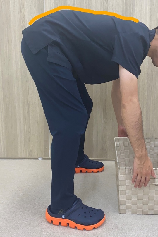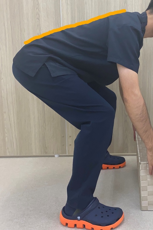 なので、写真にあるように、背中から腰にかけて引いた線がまっすぐになるようにかがむと良いです。