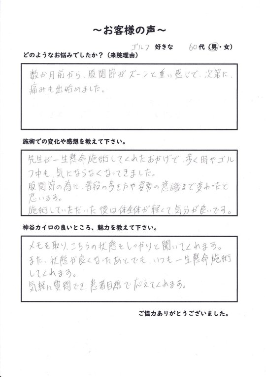 先生が一生懸命整体してくれたおかげで、歩くときやゴルフ中も、気にならなくなってきました。股関節の為に、普段の歩き方や姿勢の意識まで変わったと思います。整体後は体全体が軽くて、気分が良いです。