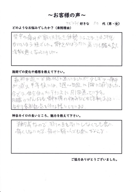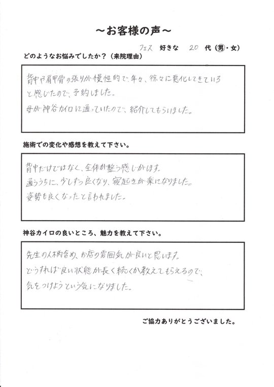背中や肩甲骨の張りが慢性的で、年々、徐々に悪化してきていると感じたので、予約しました。母が神谷カイロに通っていたので、紹介してもらいました。