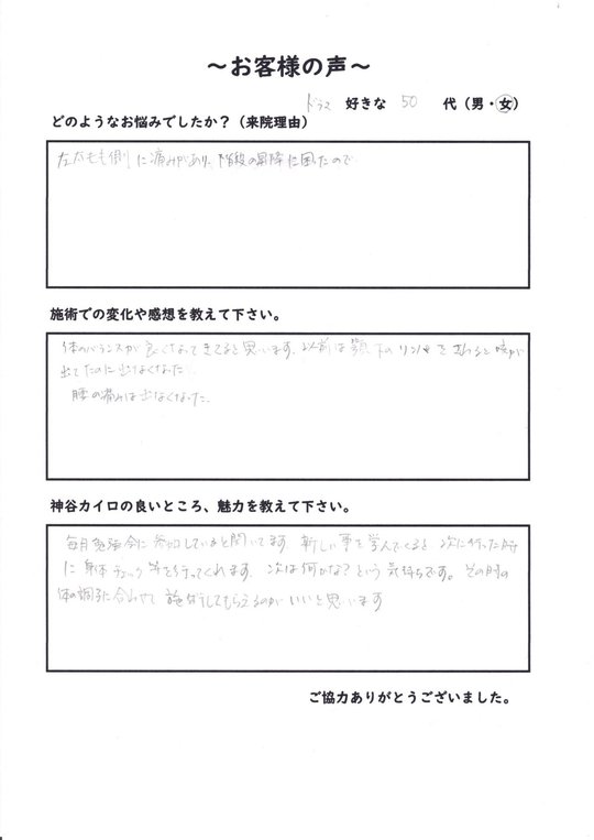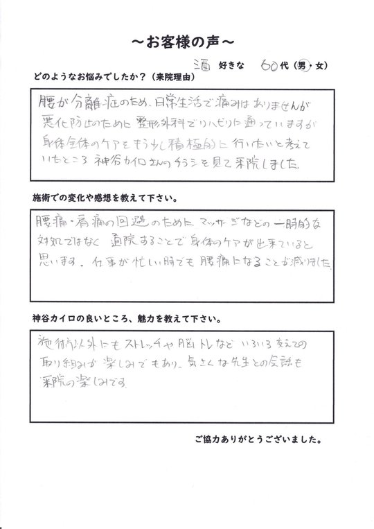 腰が分離症のため、日常生活で痛みはありませんが、悪化防止のために整形外科でリハビリに通っていますが、身体全体のケアをもう少し積極的に行いたいと考えていたところ、神谷カイロさんのチラシを見て、来院しました。