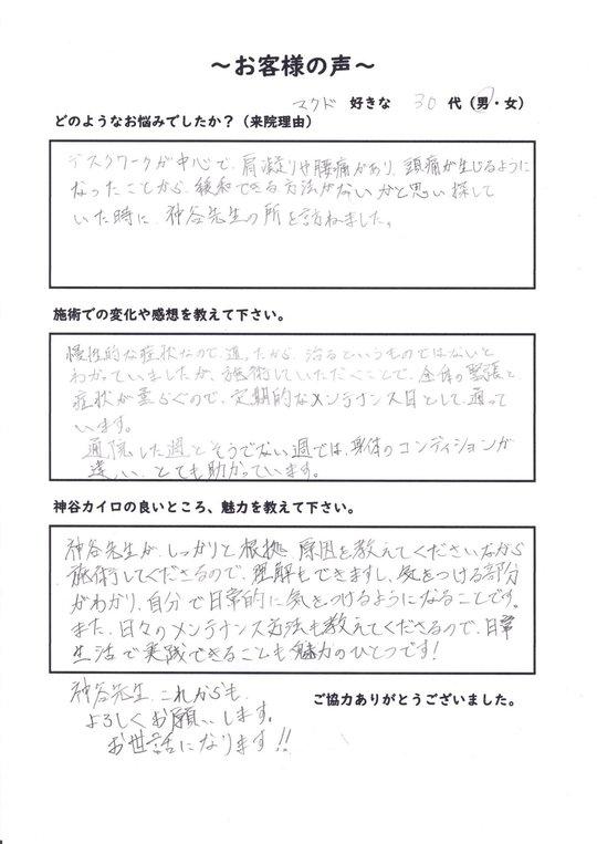 デスクワークが中心で、肩凝りや腰痛があり、頭痛が生じるようになったことから、緩和できる方法がないかと思い、探していた時に、神谷先生の所を訪ねました。