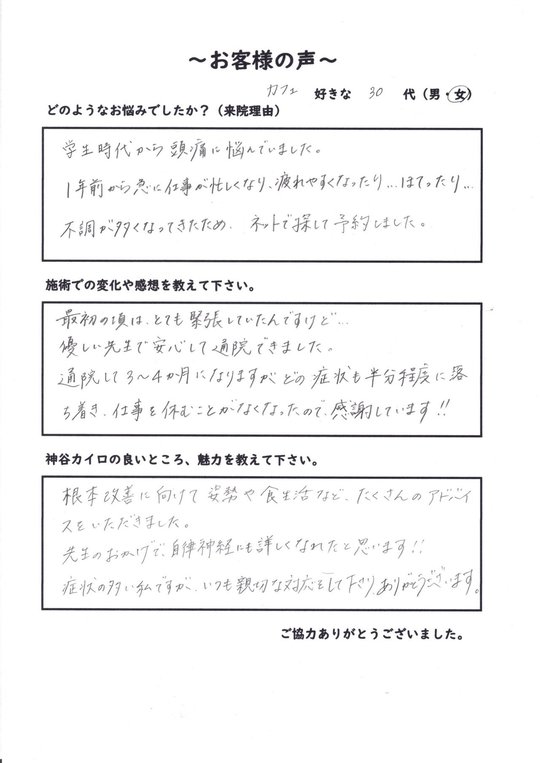 お客様の声【頭痛中心の自律神経症状】30代 女性