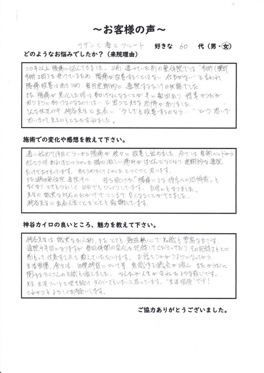 通い始めて1年目から、腰痛が徐々に改善し始めました。今では毎朝ベッドから起きる時、あれほどつらかった腰の激しい痛みがほとんどなくなり、定期的な通院だけでおさまっています。あきらめなくて良かったとつくづく思います。また、以前別の整体院通院中に持ち続けた、腰痛による将来への恐怖感もなくなり、とても嬉しく、自分でもびっくりしています。自信にもなりました。先生の誠実な対応のおかげで、ここまで良くなることができました。神谷先生に出会えたことをとても感謝しています。