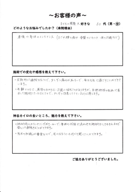 20年以上、腰痛に悩んできました。手術(腹部手術2回)を受けているため、以前通っていた別の整体院では『腰痛が改善することはない。仕方がない』と言われ、腰痛改善はあきらめ、毎月定期的に通院するだけの状態でした。また、腰痛が悪化した時は、動けなくなることが年に数回あり、将来からだが思うように動けなくなるのでは…と思うと、大きな恐怖がありました。そんな状況の中、神谷先生と出会い、少しでも改善するのなら…という思いで、思い切って先生のもとを訪ねました。